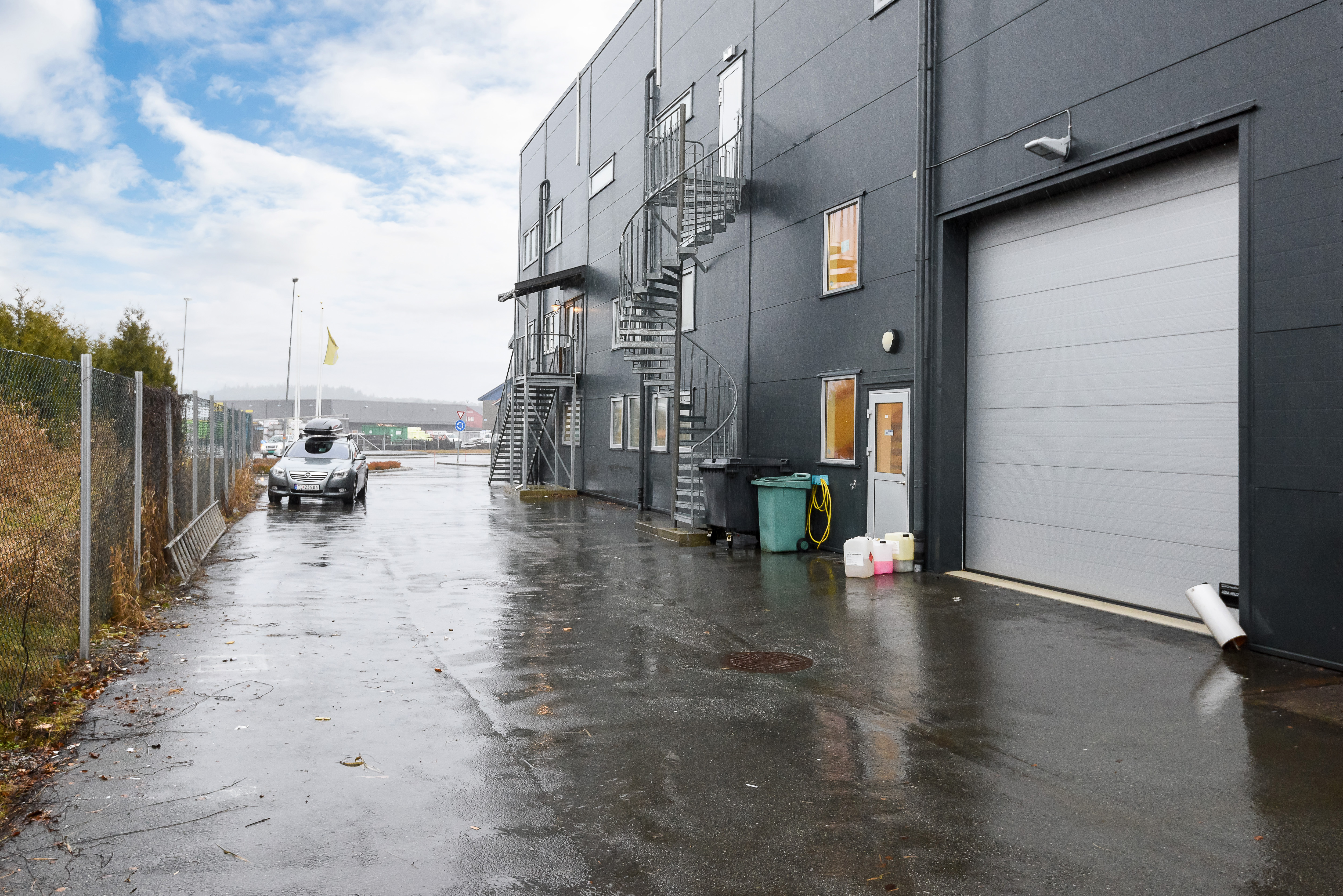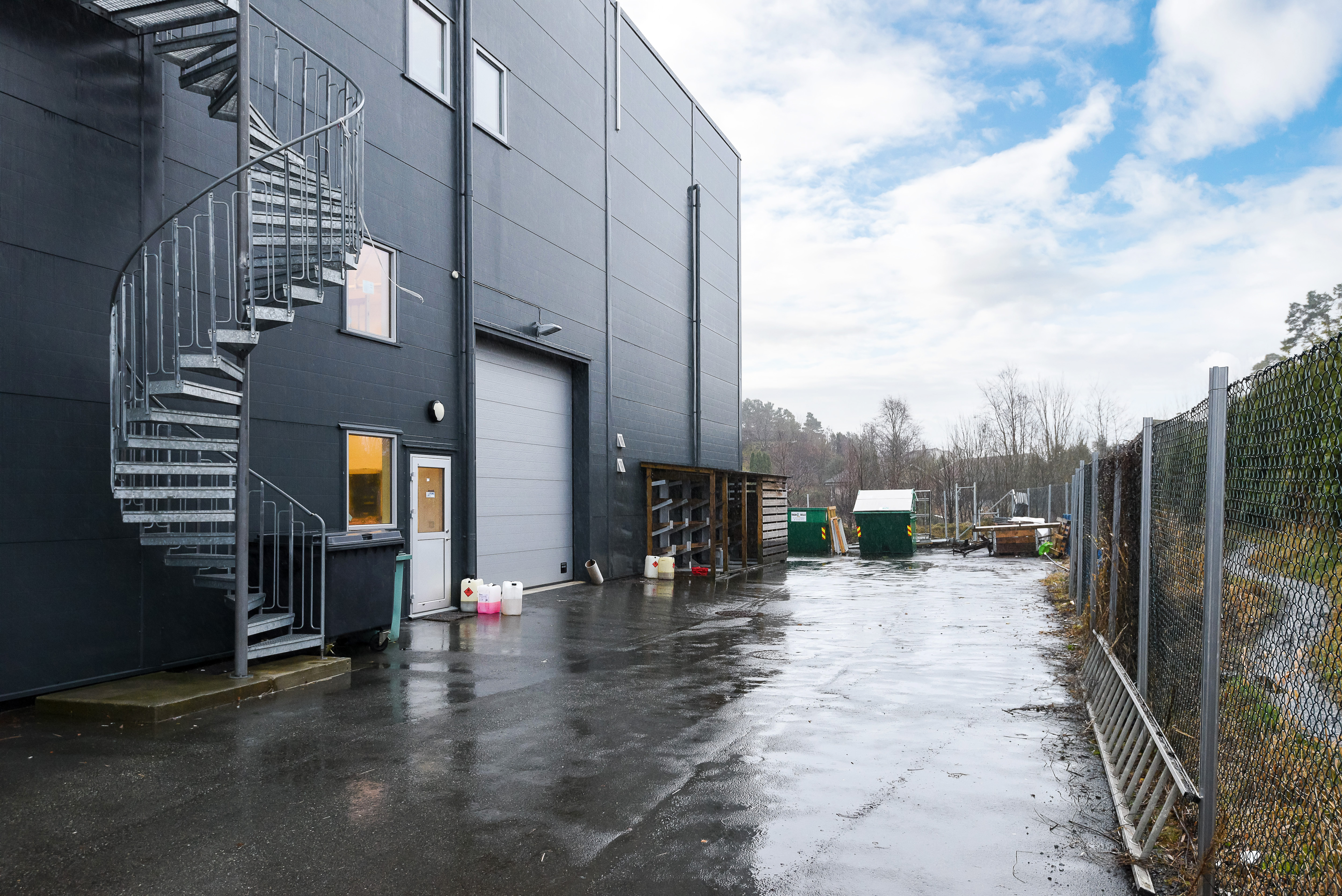 Det er inngjerdet uteplass ved lager. Ca. 15 parkeringsplasser i front av bygget.