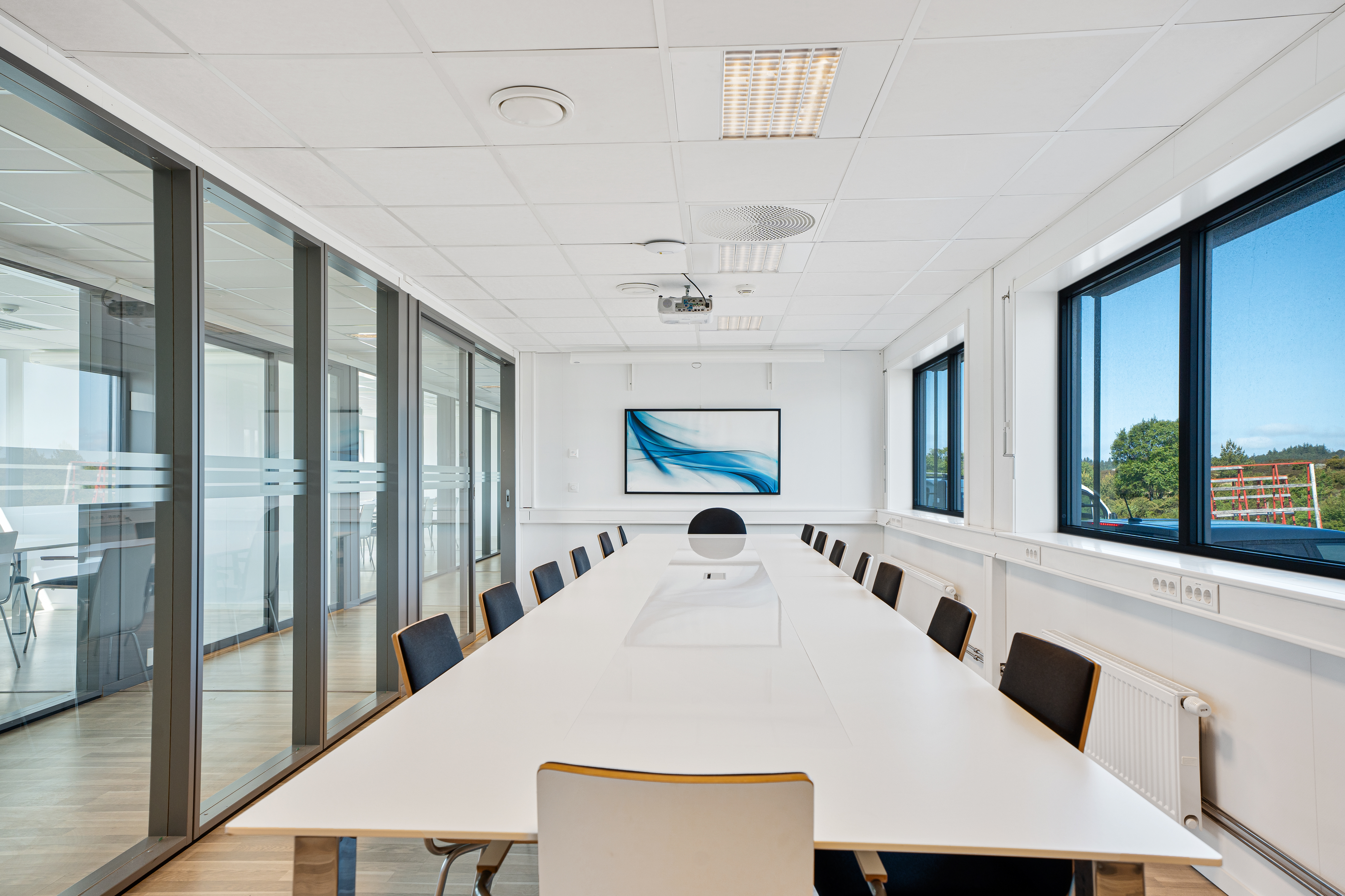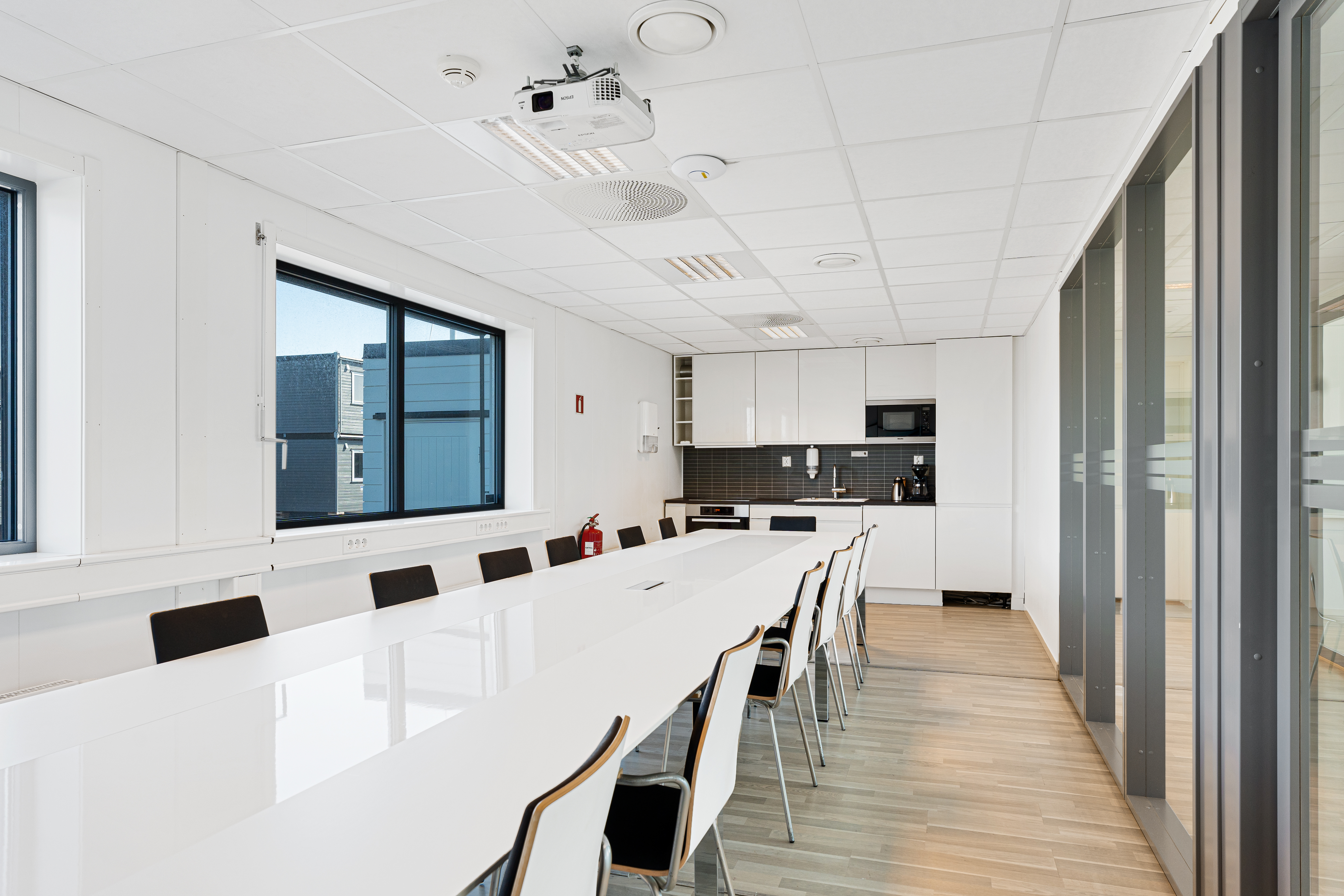 -I vestlig fløy er det tre store møterom, ett mindre møterom, spiserom/kjøkken og et stort uinnredet areal på ca 90m2 som kan benyttes som kontorlandskap eller oppdeles i cellekontorer/møterom.