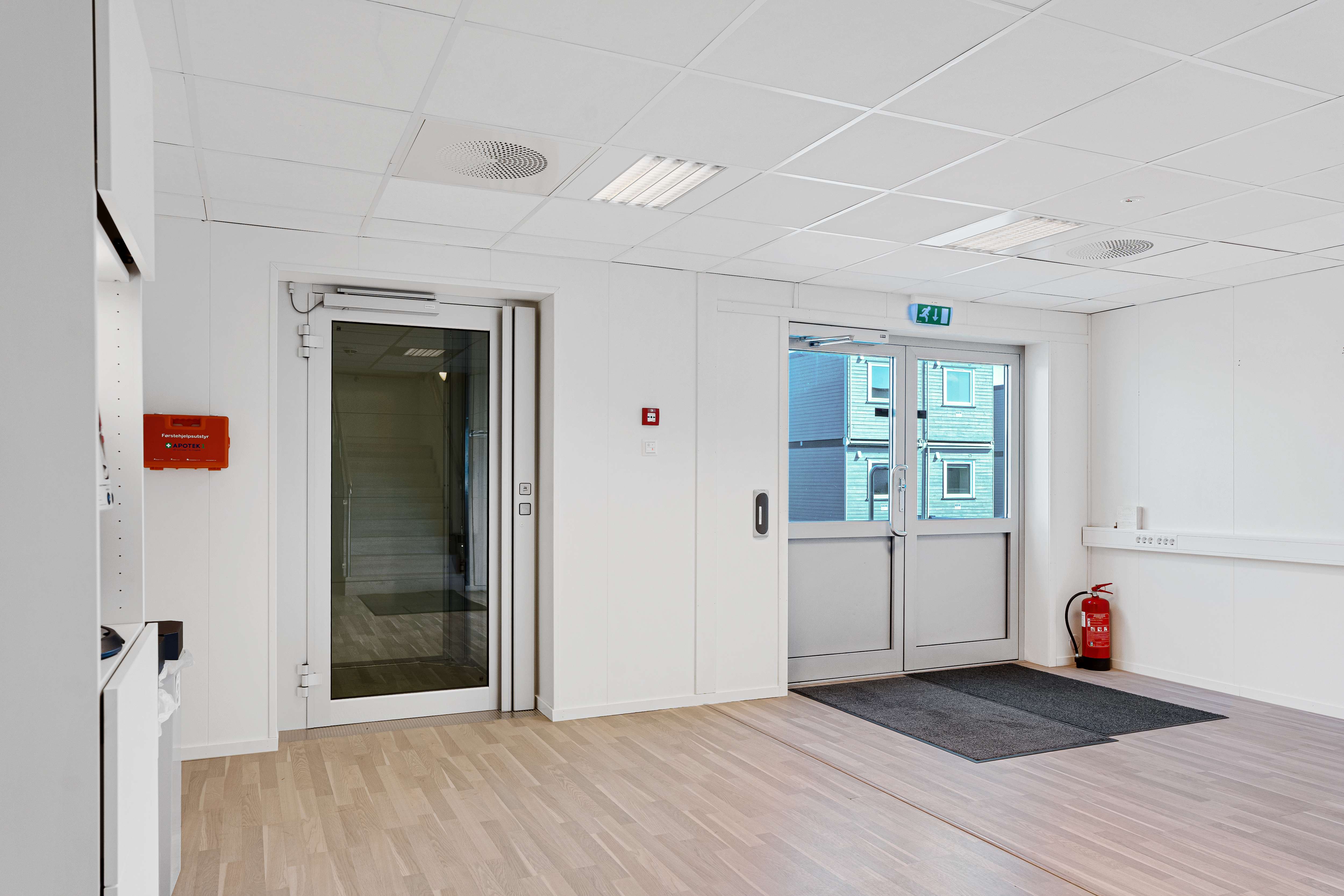 -Inneholder resepsjon/trappeoppgang i midten av bygget.