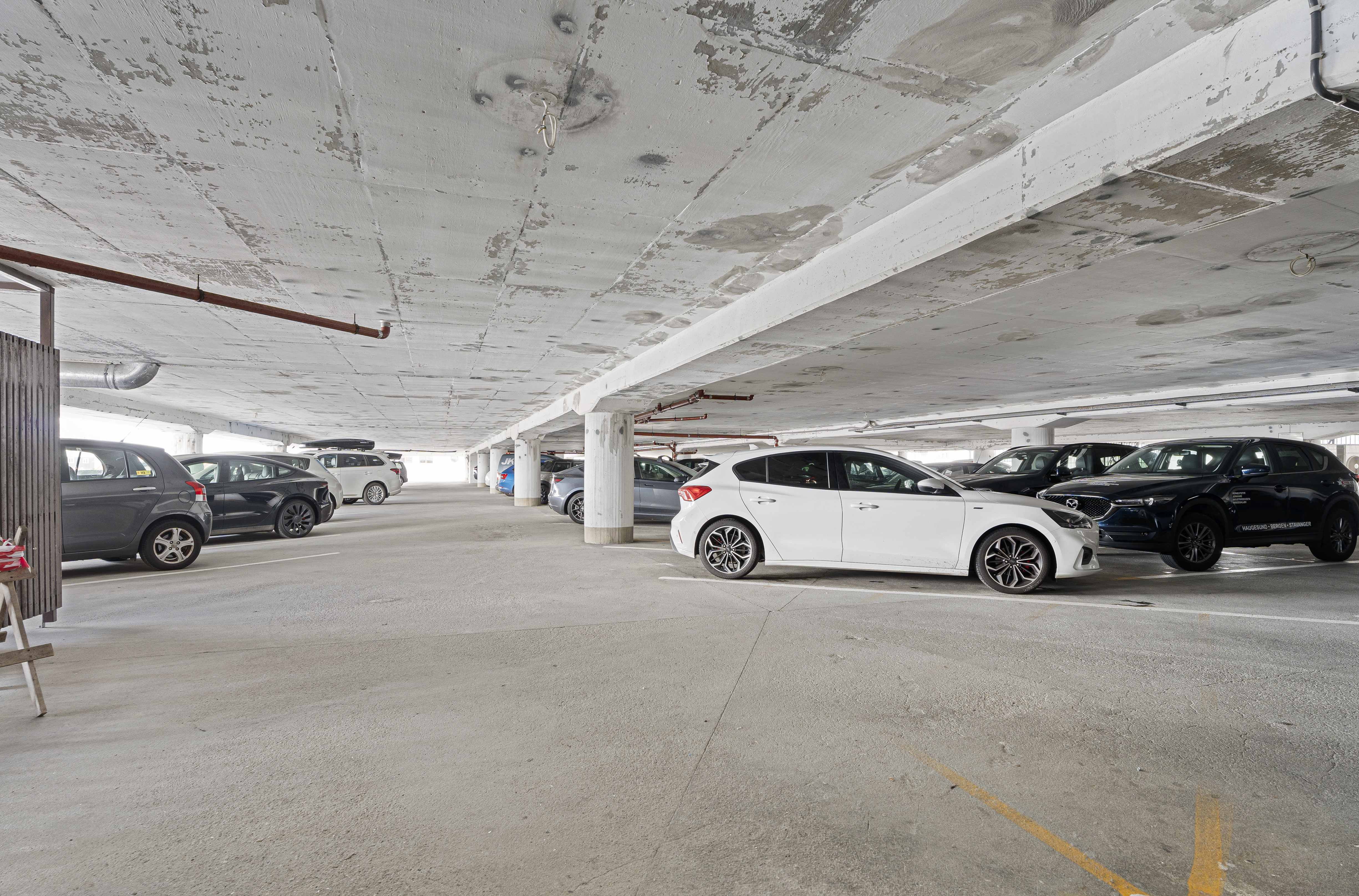 Det er 6 parkeringsplasser på østsiden av bygget i tillegg til stort parkeringshus i etasjen under.
