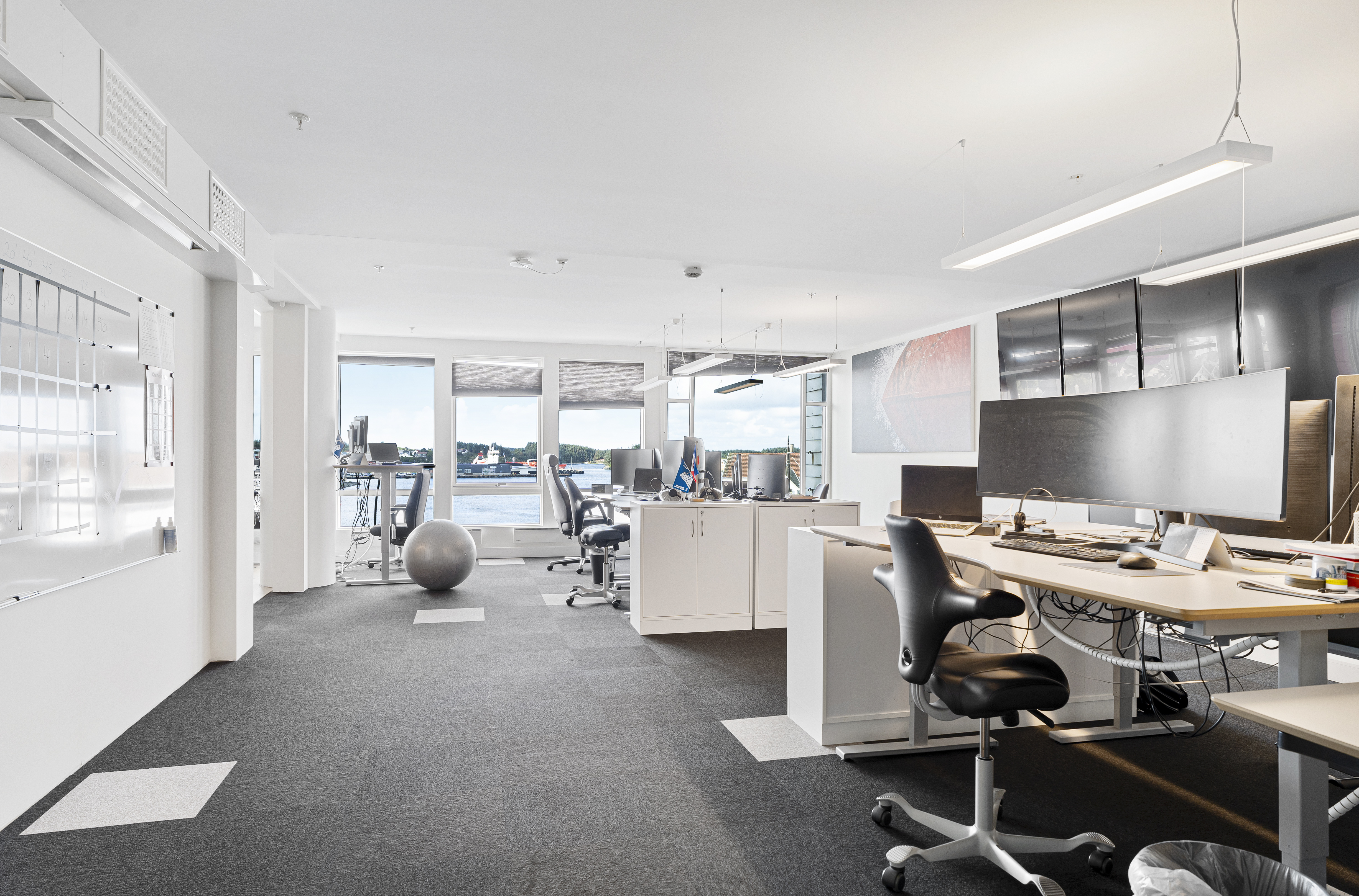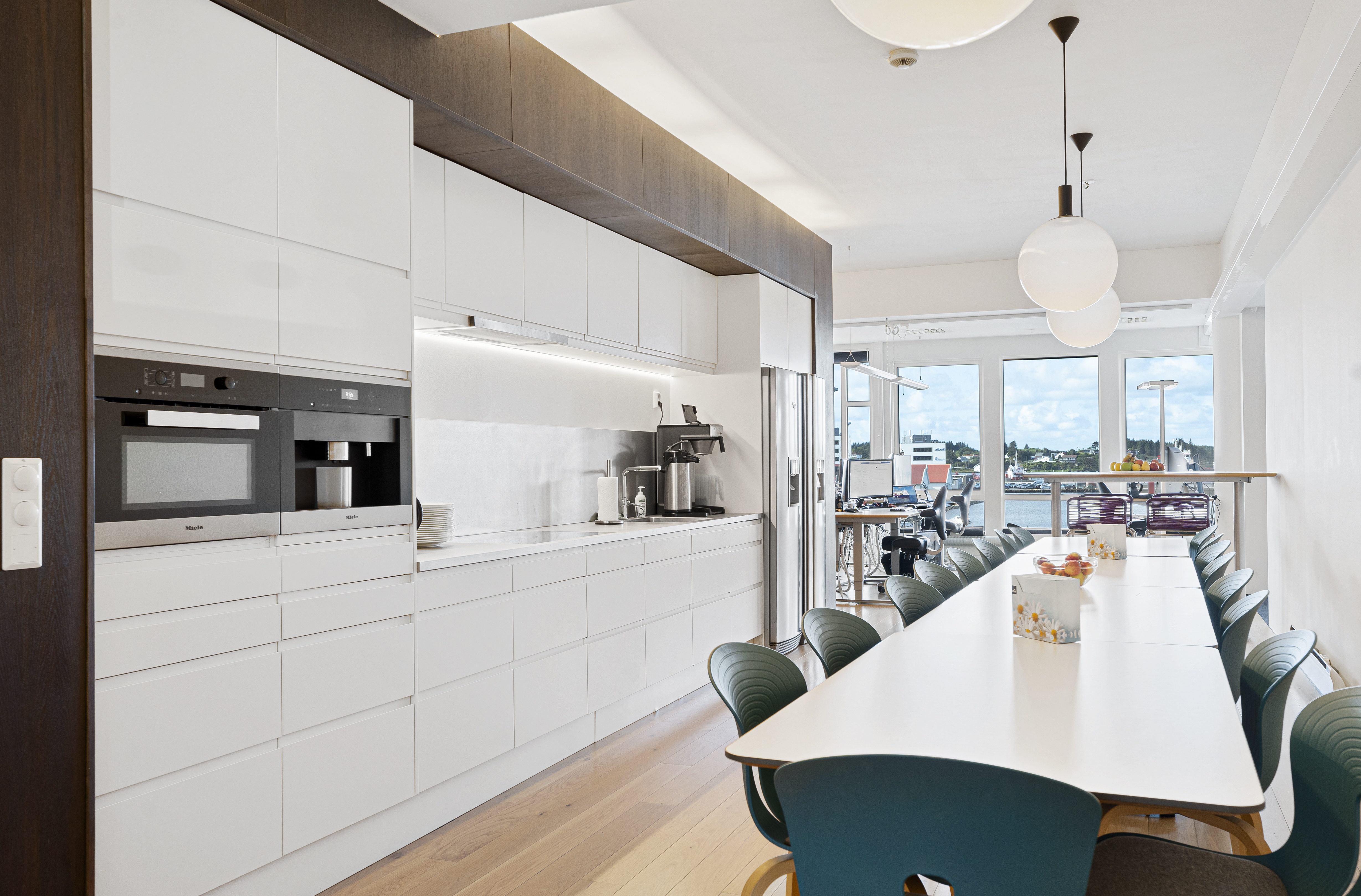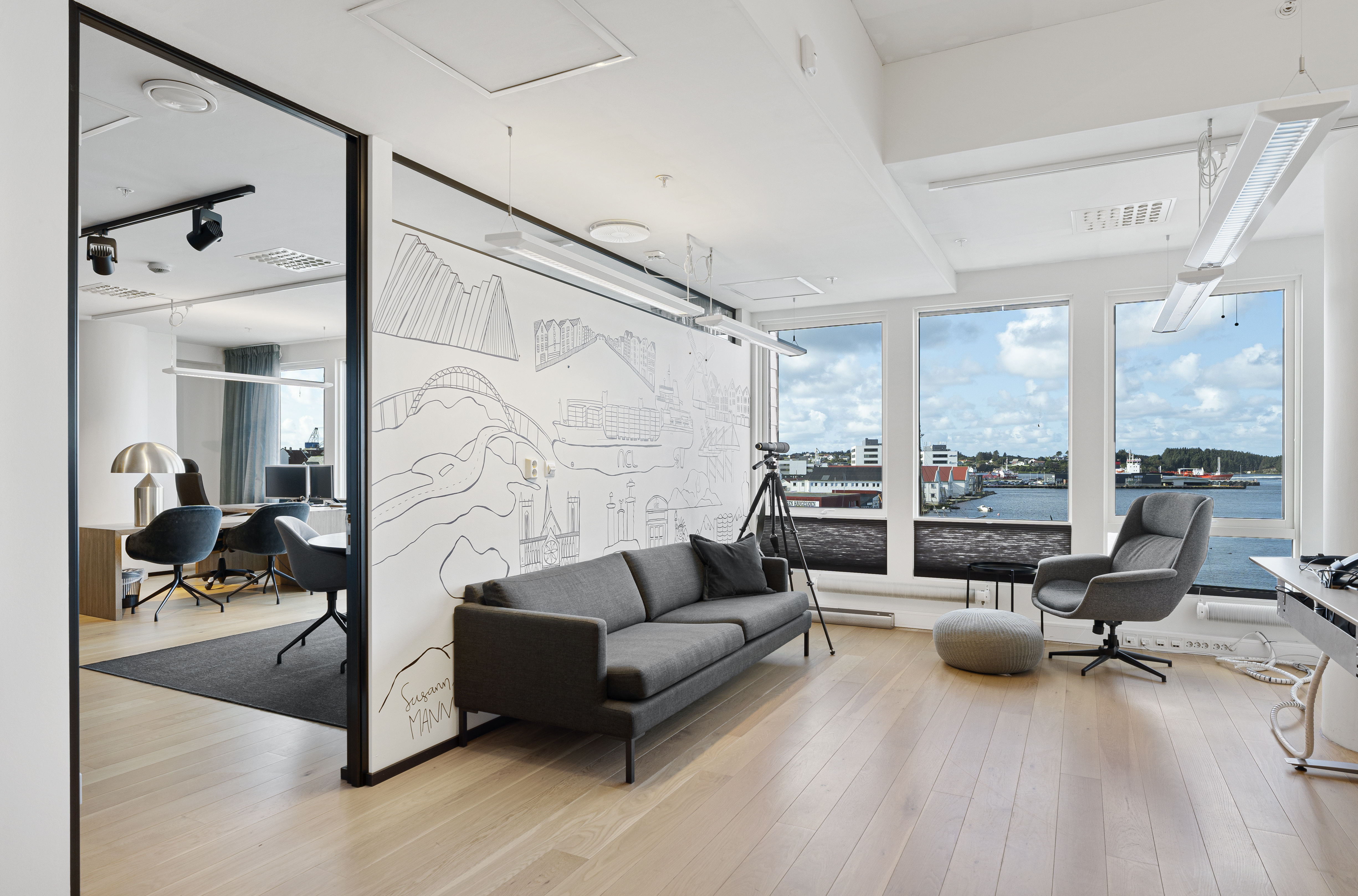 -Moderne innredet kontorlokale med flotte, sosiale fellesområder og utsikt mot smedasundet.