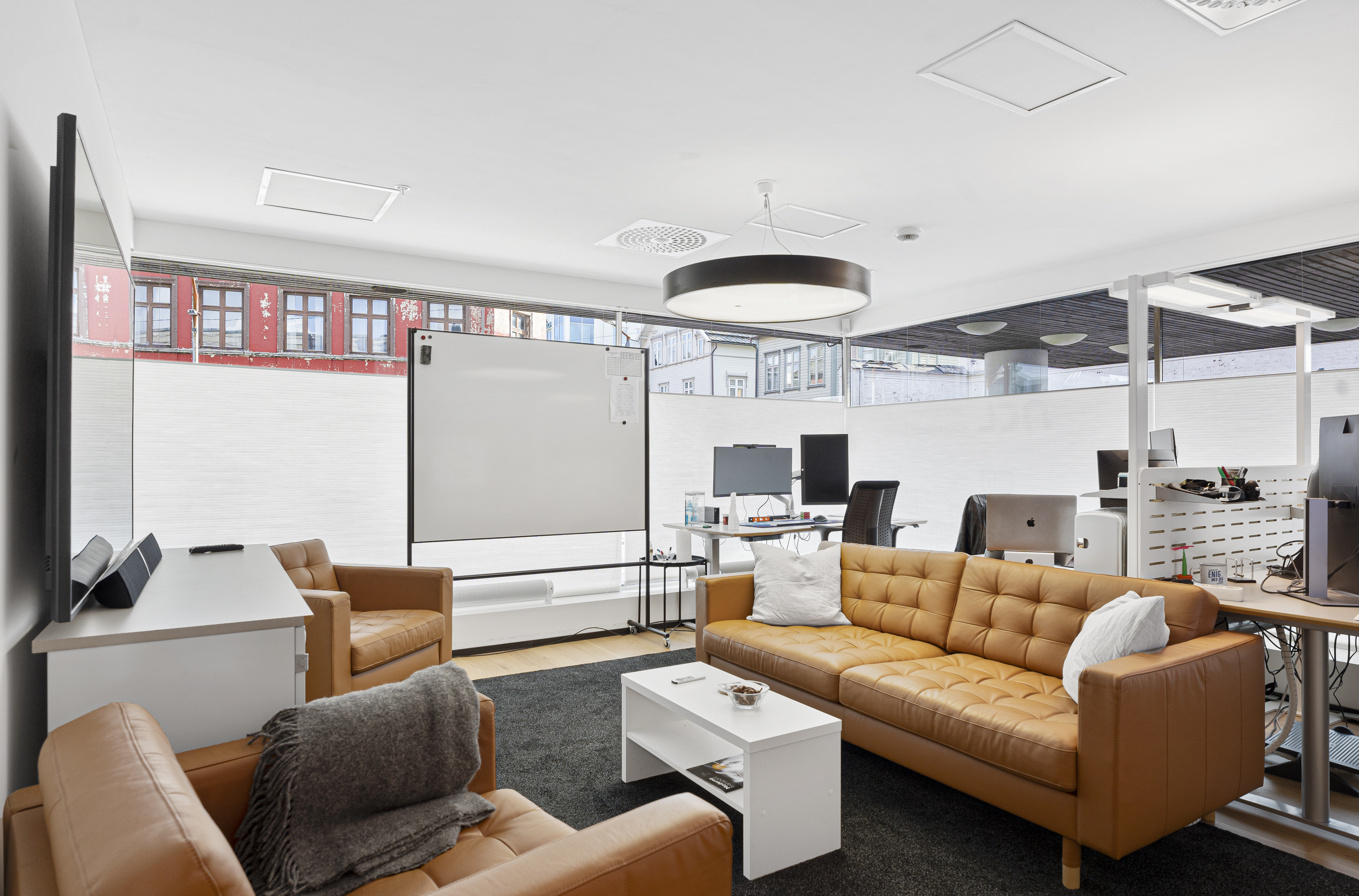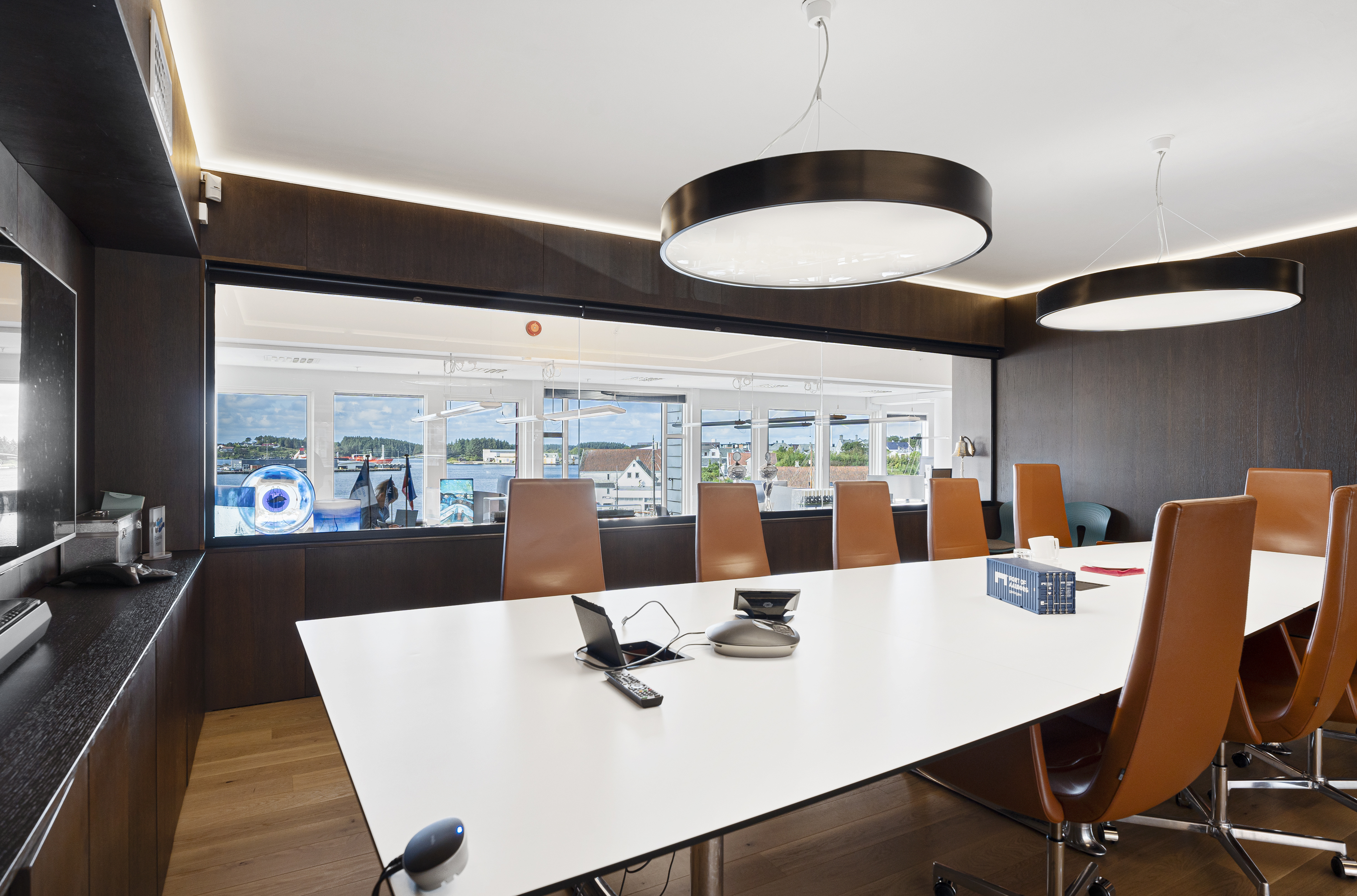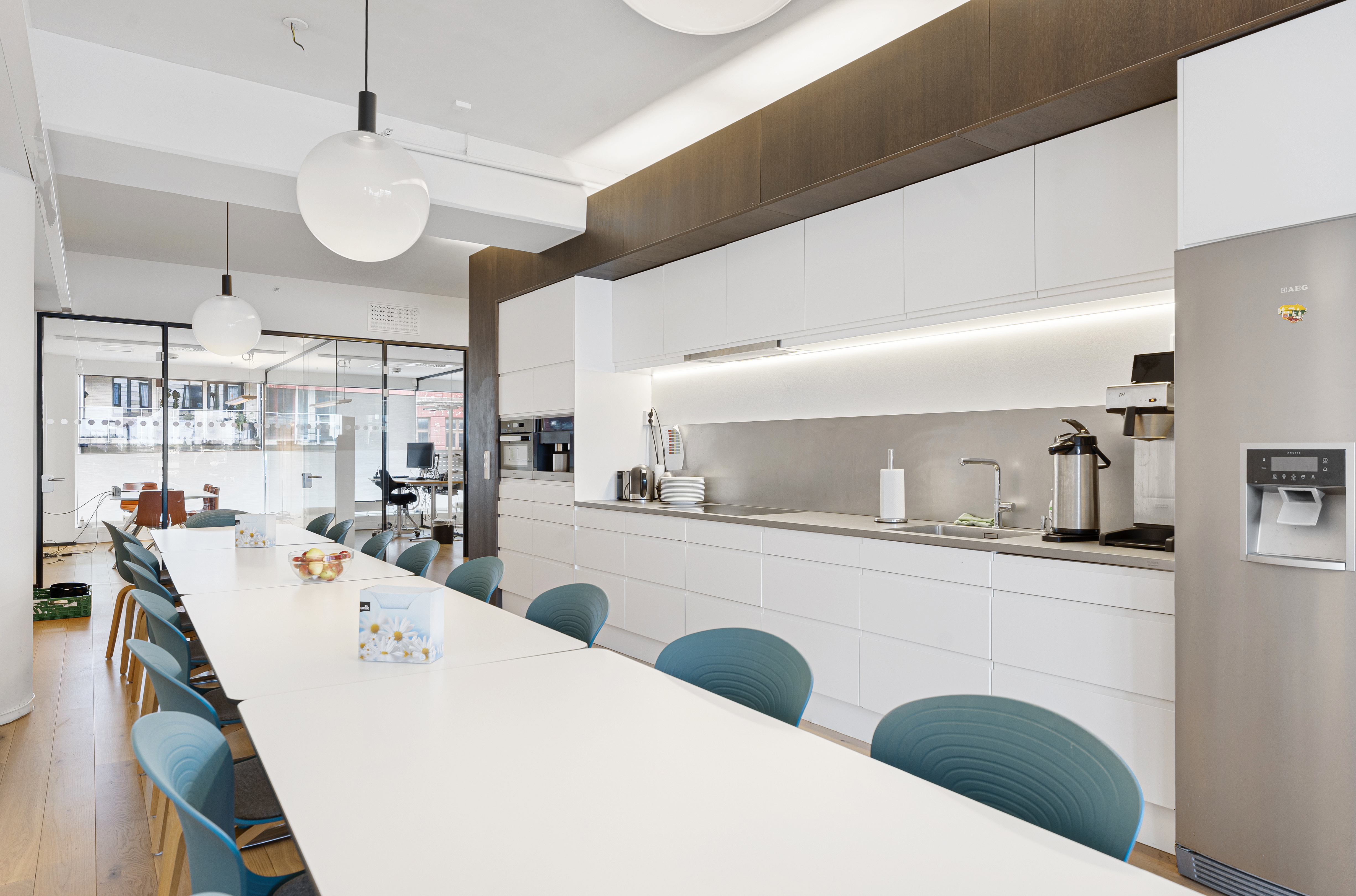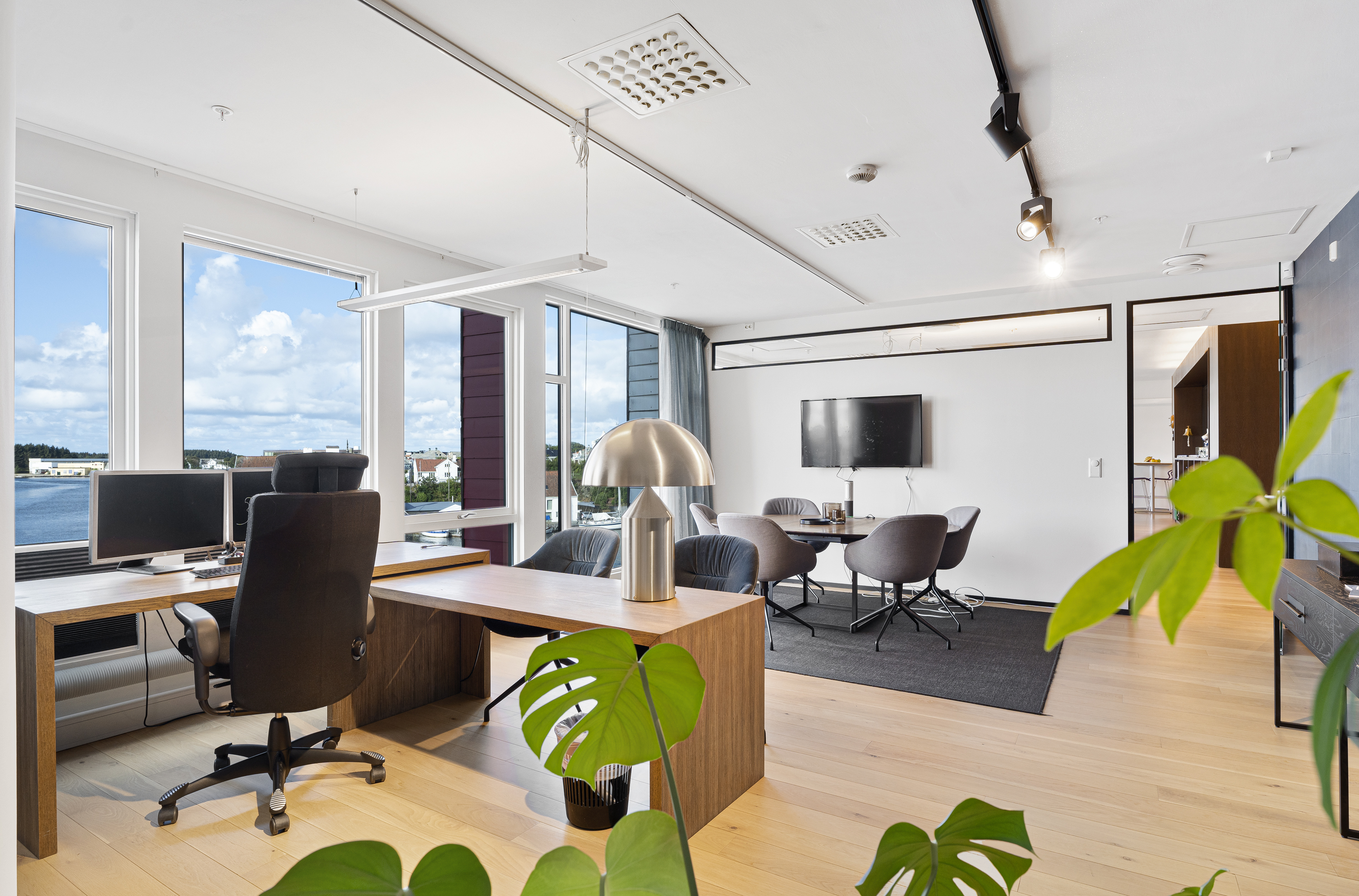 -Moderne innredet kontorlokale med flotte, sosiale fellesområder og utsikt mot smedasundet.