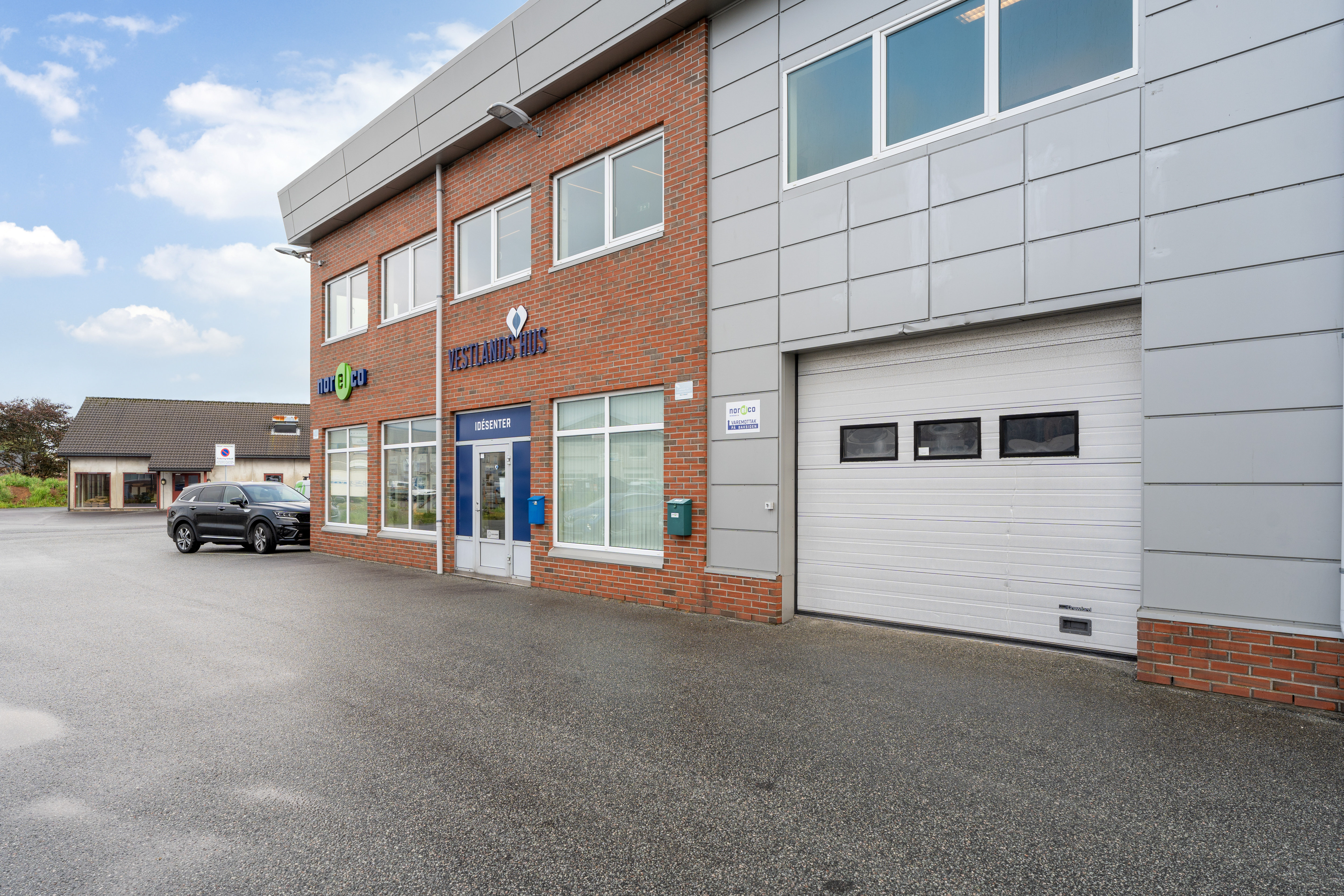 Seksjonene har merket parkering i front av bygget og langs vestre fasade.